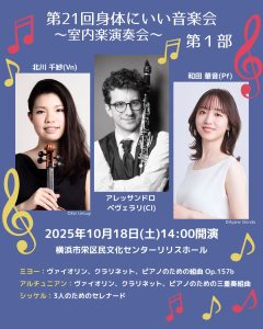 第1部:北川千紗(ヴァイオリン)・アレッサンドロ・ベヴェラリ(クラリネット)・和田華音(ピアノ)